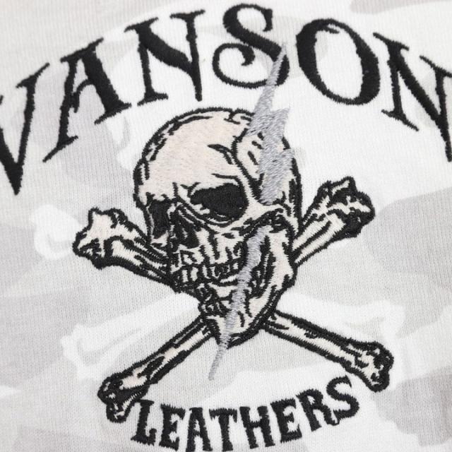 前後のスカルボーン&『VANSON LEATHERS』ロゴは刺繍!スカルを貫くイナズマ刺繍はリフレクター仕上げ…(-ω☆)キラリ