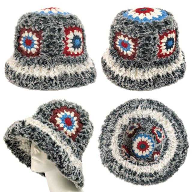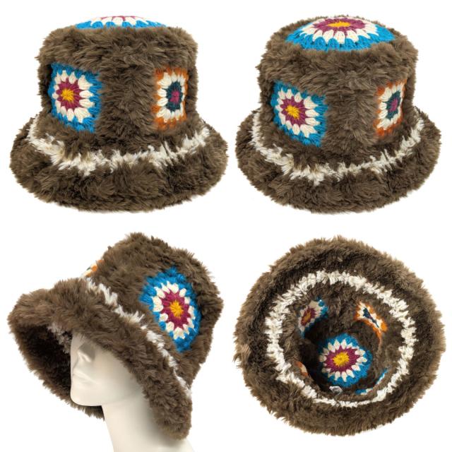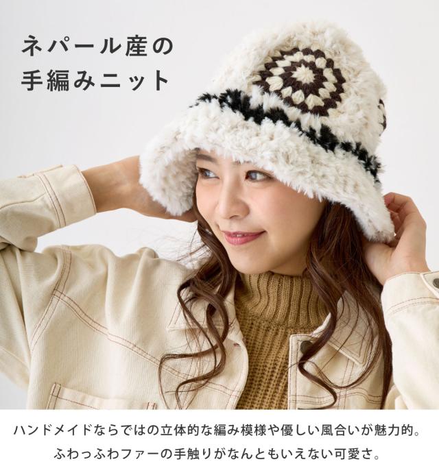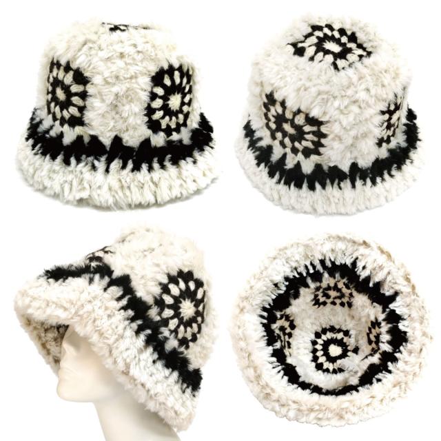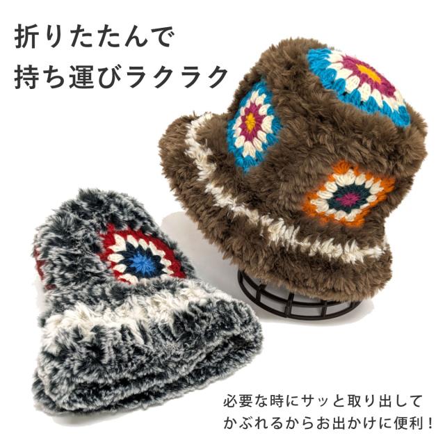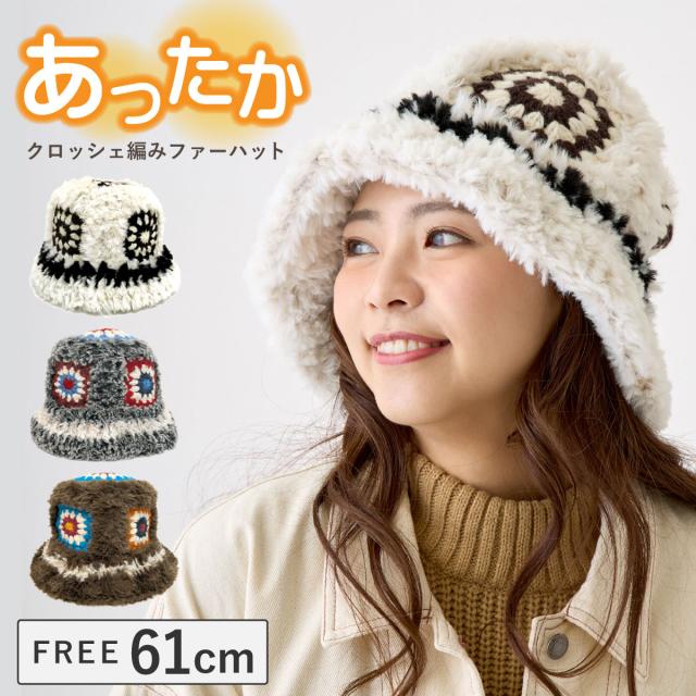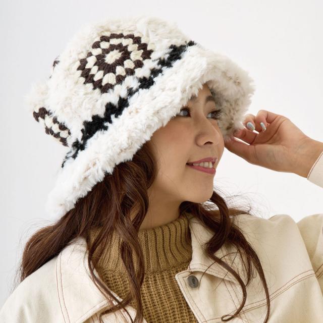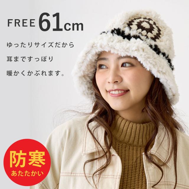 レディース 大きめ ハット クロッシェ編み 可愛い 防寒帽子 手編みニット&ファー 深め 61cm 秋冬 暖かい hat-1516 BIG 大きい 帽子 バケットハット モチーフ 日よけ エスニック柄 小顔 ファーハット 折り畳み ギフト Xmas プレゼント