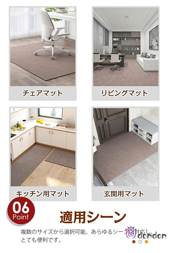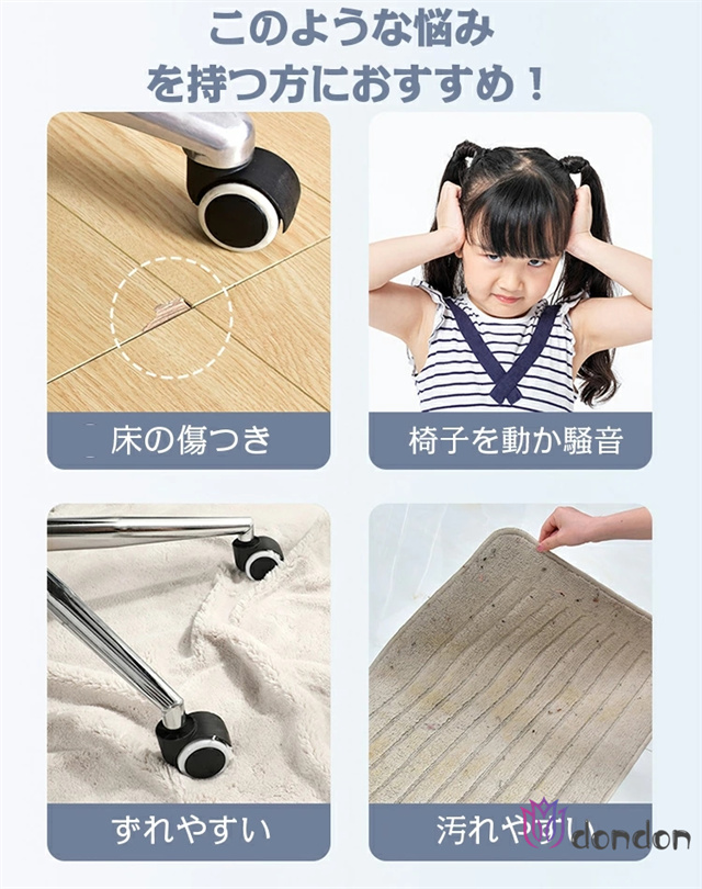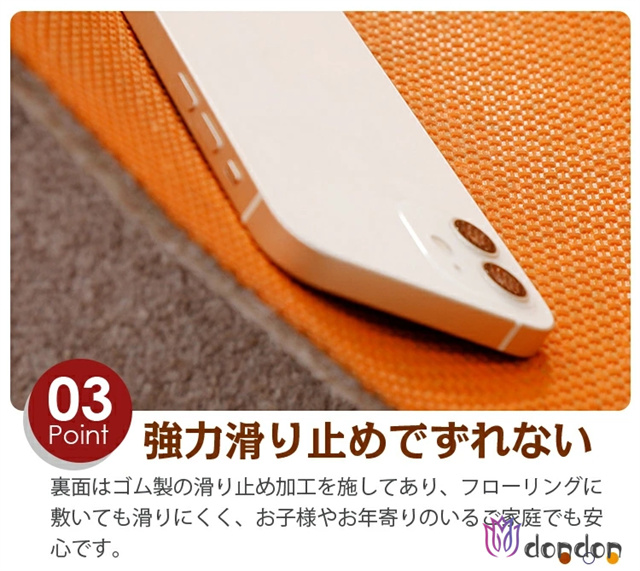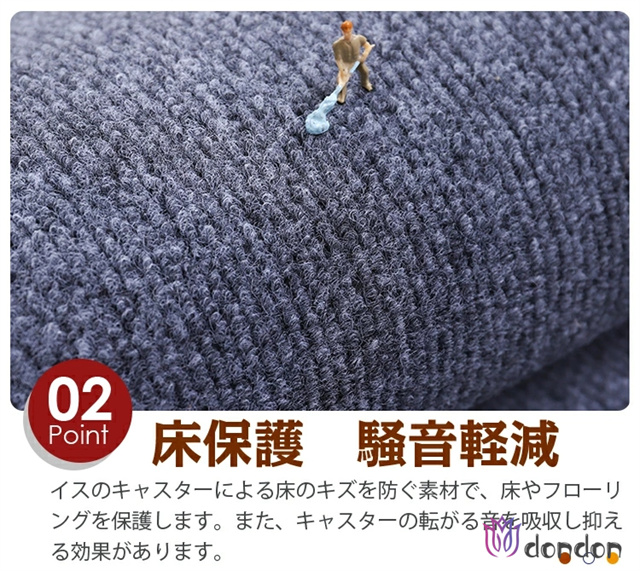 - フローリングでキャスターを使いたく、薄いマットを探してました。こちらの決定、滑り止めがついているのでズレません。キャスターゴロゴロしても問題ありません。