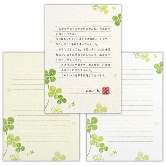 若々しい四葉に飾られた便箋です。白と薄い緑色の2色アソートです。優しいクローバーが描かれています。書いた時のイメージがしやすいよう、表紙に文例を載せました。
