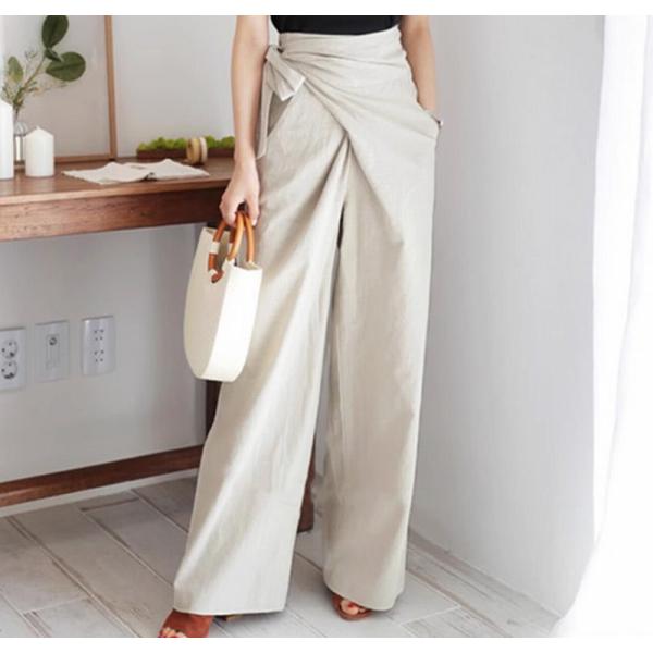 パンツ ボトムス レディース 綿麻 ワイドパンツ リボンベルト付き リネンパンツ フレアパンツ ハイウエスト 美脚 ガウチョ 送料無料