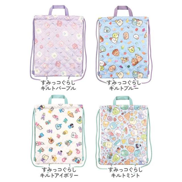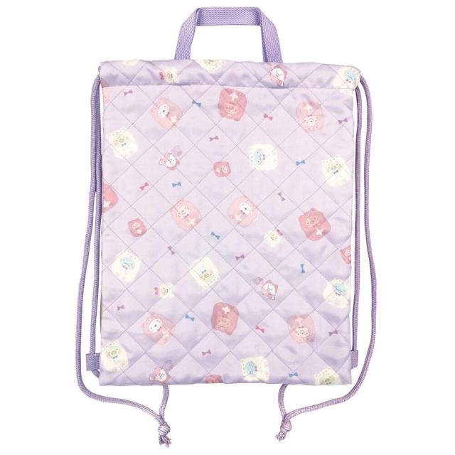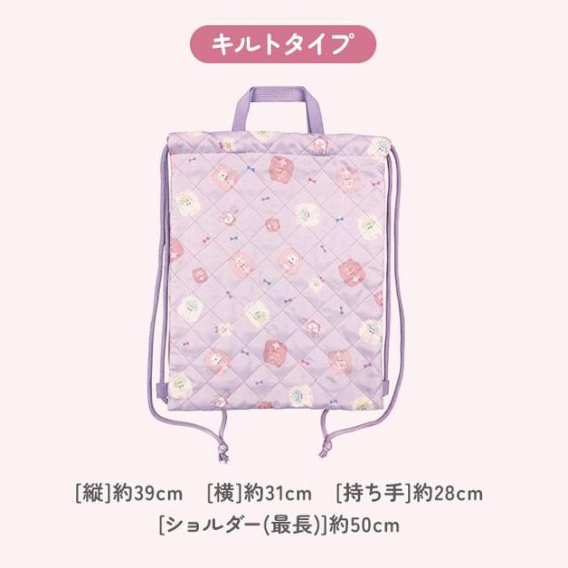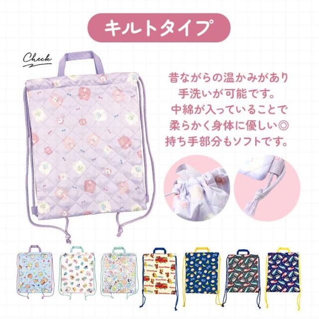 キャラクターのプリントデザインが可愛い♪体操着入れやお道具入れにぴったりなナップサック。【開閉楽チン♪】サイドの巾着紐やベルトをキュッと絞るだけ!お子さまでも簡単に開閉が可能。【2タイプ展開】キルトタイプとポリエステル製タイプの2タイプをご用意♪どちらも可愛いキャラクターデザインと軽い背負い心地が嬉しい◎【体育着入れや図工袋として】A4サイズ対応で学校で必要な小物をひとまとめに!体育着はもちろん、図工など授業で使う小物を入れるのもおススメ♪【調節可能】キルトタイプは紐の結び目の位置、ポリエステル製タイプはベルトのアジャスターでショルダー部分の長さ調節が可能!お子さまの成長に合わせて低学年から長く使える♪【持ち手付き】持ち手付きなので、手提げとしても使用OK。【はっ水加工】ポリエステル製タイプは生地表面にはっ水加工施し、雨の日の通学用にも◎汚れにもお手入れも楽チン。(※キルトタイプにはっ水機能はございません。)【幅広いシーンで活躍☆】通学のサブバッグとして使うのはもちろん、習い事やお出かけ時のカバンとして使うのもGOOD!大好きなキャラクターといつも一緒に外出を楽しめるアイテム♪