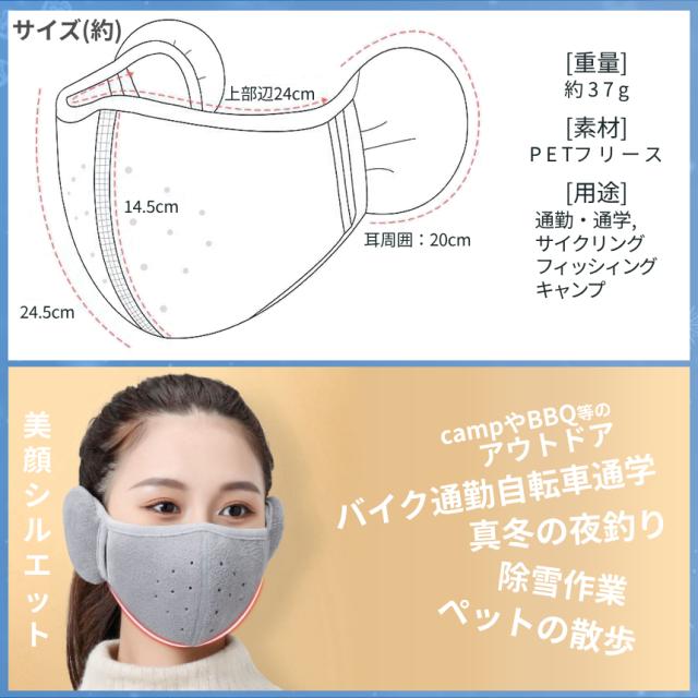 【商品説明】\フリース素材の暖かマスク/耳までもしっかりカバーできるフリース素材の秋冬マスクです。柔らかゴム搭載で長時間着用しても痛くなりにくい♪口元から耳までを一括に覆うことで、マスク内保温設計♪寒い時期の通勤、通学、バイク出社や秋冬のスポーツ観戦や夜釣り、屋外BBQやキャンプにも幅広くお使い頂けます!※雨天時のご使用はご遠慮下さい========【商品仕様】サイズ:フリーサイズ材質:フリースカラー:ブラック、グレー、ブルー、ピンク、 ダークグレー※日本語説明書は付属しておりません。※手洗いのみ可能で洗濯機不可漂白剤不可です。※モニターにより色合いが若干前後する場合がございます。※輸入品ですので多少の臭いやスレ傷、汚れはご了承ください。========※詳細は画像にてご確認ください