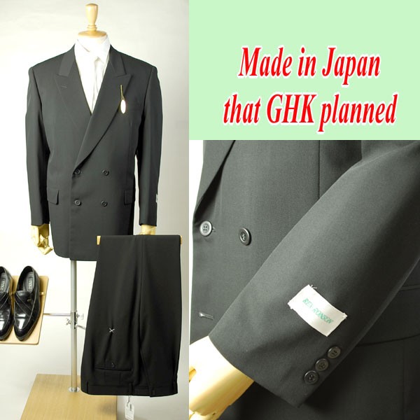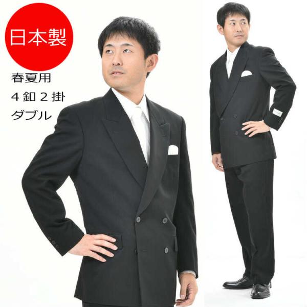 日本製夏服ダブル4B×2ブラックスーツ黒のダブル略礼服喪服アジャスター付パンツ裾未処理。