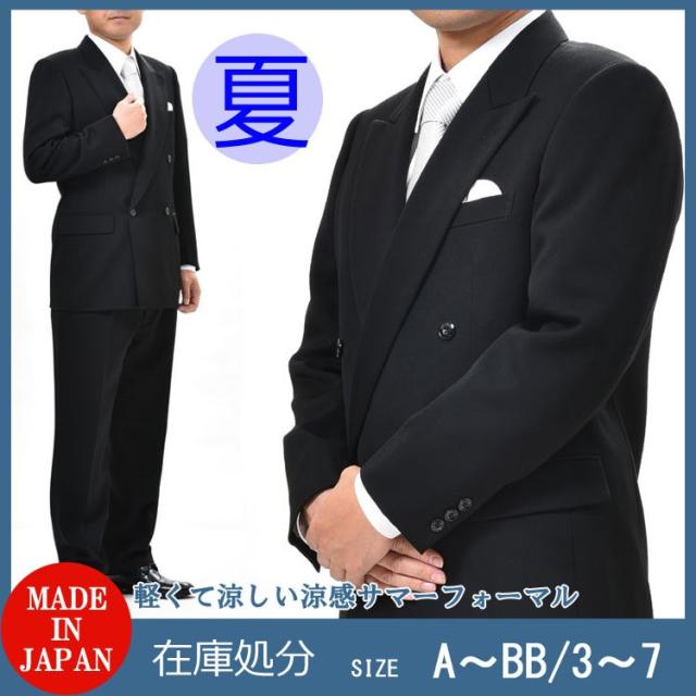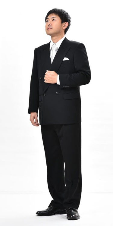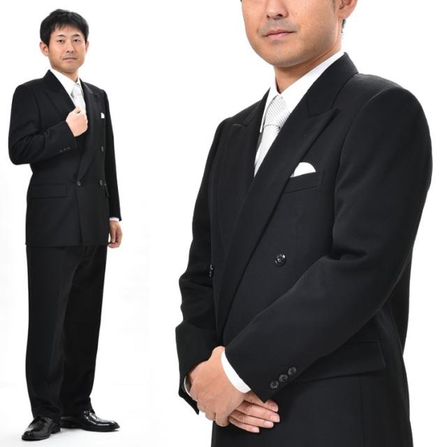 日本製夏服ダブル4B×1ブラックスーツ黒のダブル略礼服喪服 アジャスター付パンツ裾未処理 パンツはワンタック仕立て。