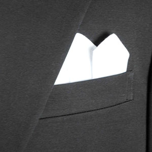 正式の場のモーニング、タキシードのほか全ての略礼服のフォーマルシーンに欠かせないポケットチーフです。
