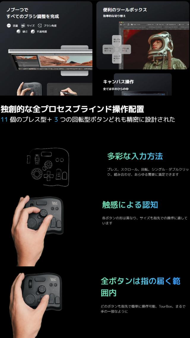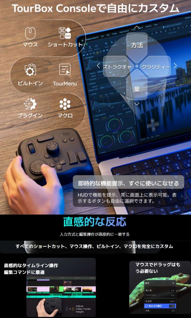 TourBox Eliteはソフトウェアとハードウェアの直感的な交信、独特なスクリーンインタラクション、触覚フィードバックなど多彩な方法によって、編集、色調補正、写真加工、音楽制作、絵描き、デザインなどの創作プロセスを革新します。