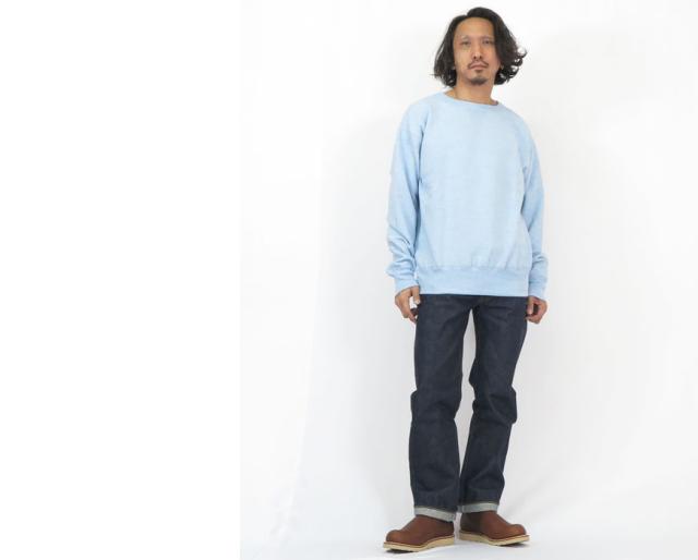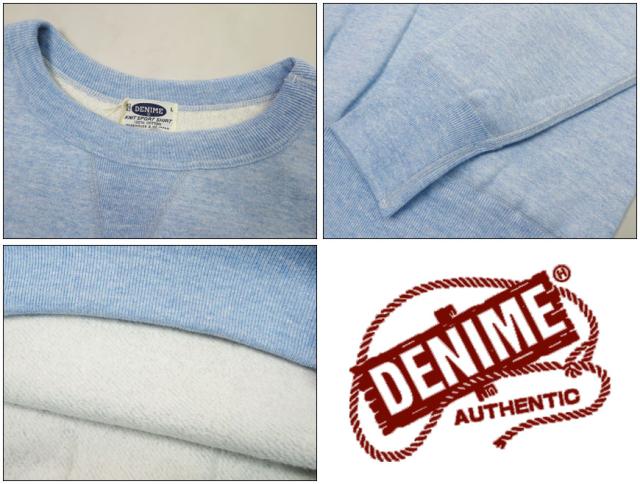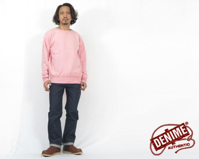 「サージ・ドニーム」はフランス、ニーム地方の生地という言葉から由来しているように、 「DENIME」ではアメリカに限らず、世界中から「DENIME」のニーズに合う素材を求めたいと思っています。そして「リアルベーシック」をテーマに置いて作られる、デニムに欠かすことのできないカットソーを紹介します。 DENIMEのスウェットシャツは、スウェットがアスレチックウェアから、デイリーウェアとして、カジュアルファッションの代表的な存在となった時代をテーマに展開しています。 生地はアメリカ生まれのコットンを使用して作られたムラ糸を、吊り編み機を用いて編まれたものです。裏起毛がかけられて仕上がるその生地の風合いは、表面はやや粗野な雰囲気を持ちながら、触感は極上の柔らかさがあり、強度を持ち合わせています。縫製はフラッしシーマーと呼ばれる4本針で、着用にストレスを感じない仕様で身頃とリブを繋いでいます。シェットランドセーターを彷彿させるきれいな発色も、DENIMEの特徴です