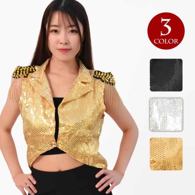 スタッズ&チェーン付き スパンコールベスト ダンス衣装 ステージ衣装 W33N17 [M便 3/4] ジャケット ダンサー ジャズダンス ヒップホップ コスプレ衣装 コスチューム 派手 キラキラ レディース/袖なし/裏地付き/ブラック-ゴールド-シルバー フリー