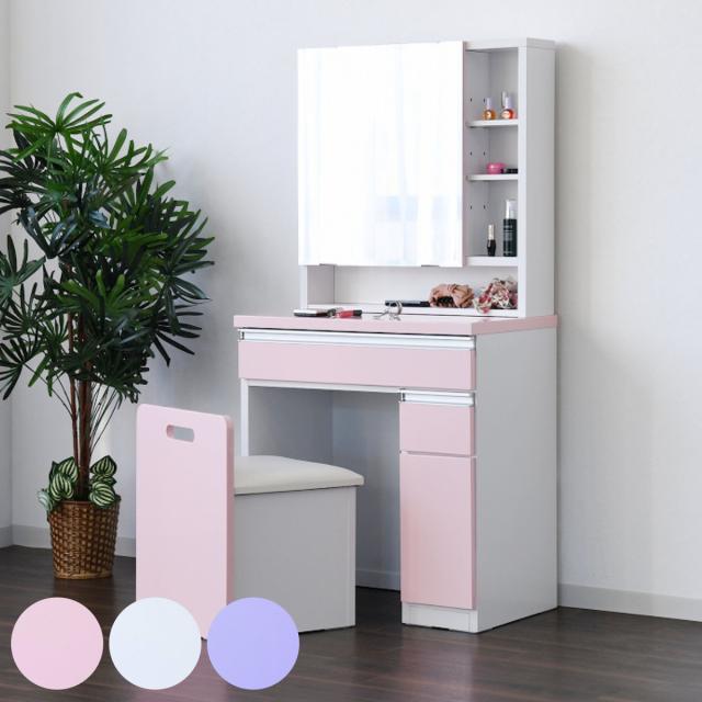 ドレッサー 幅65cm 鏡台 一面鏡 ローズ ( スツール付き コンセント 奥行42cm コンパクト スリム メイク台 鏡面裏 大容量 たっぷり 収納 可動棚 ピンク ホワイト パープル 白 光沢 かわいい )