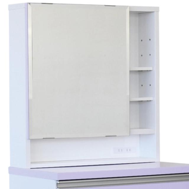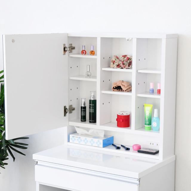 すぐに手に取ることができる収納にはティッシュや香水、パッケージの可愛いコスメを置いておくのにピッタリです。ミラー扉を開くと中にも収納がたくさんできます。棚板は可動式なので高さのあるスキンケア類など収納する物に合わせて高さ調整が可能です。