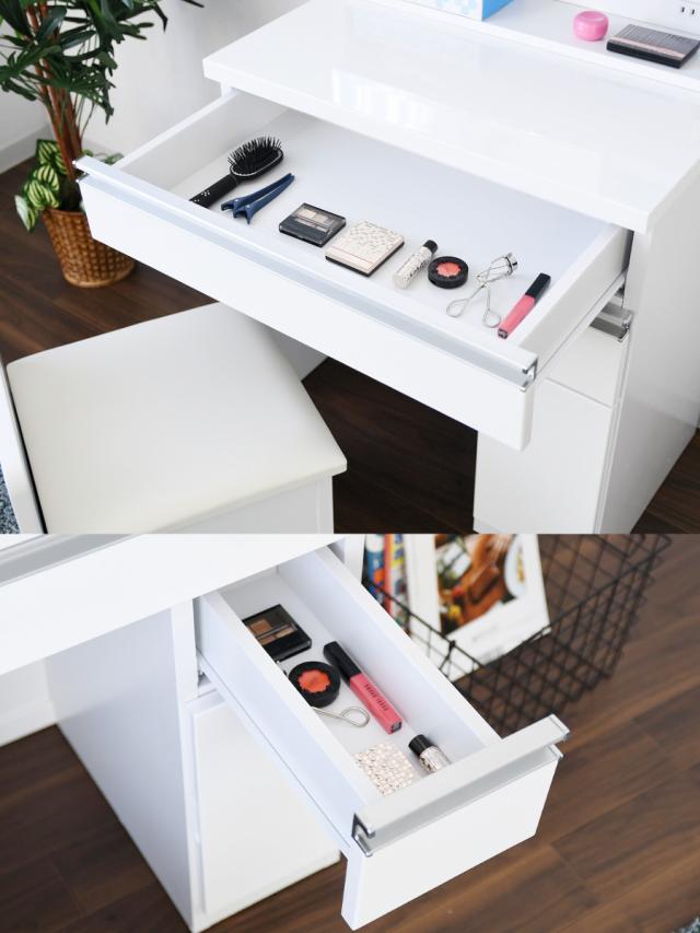 天板下は大きめのワイドに使える幅広タイプの引き出しが付いています。毎日使うメイクアイテムやネイル用品などの収納に便利です。引き出しはスライドレースを採用しているのでスムーズに開閉できます。2段目には小物の収納に便利な小さな引き出しが付いています。