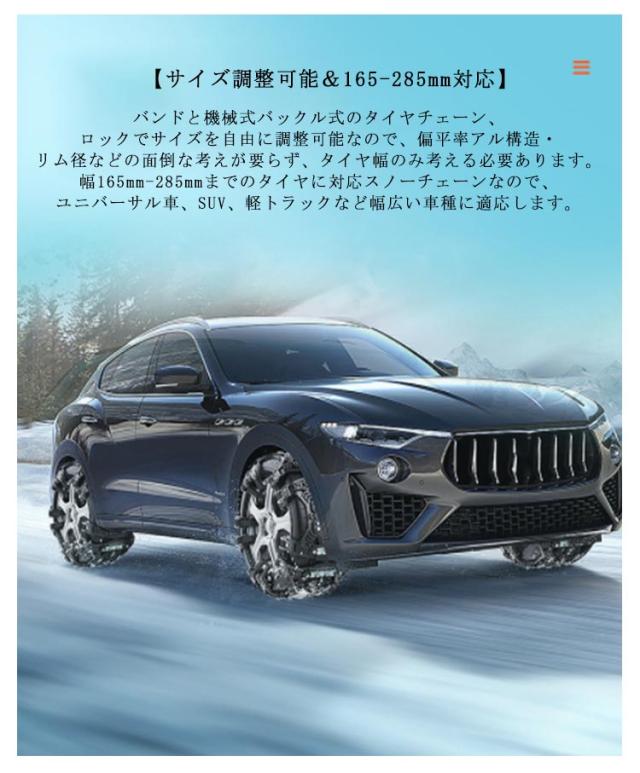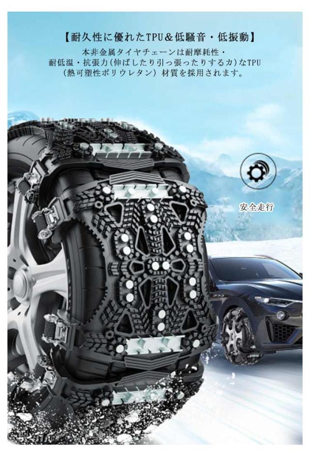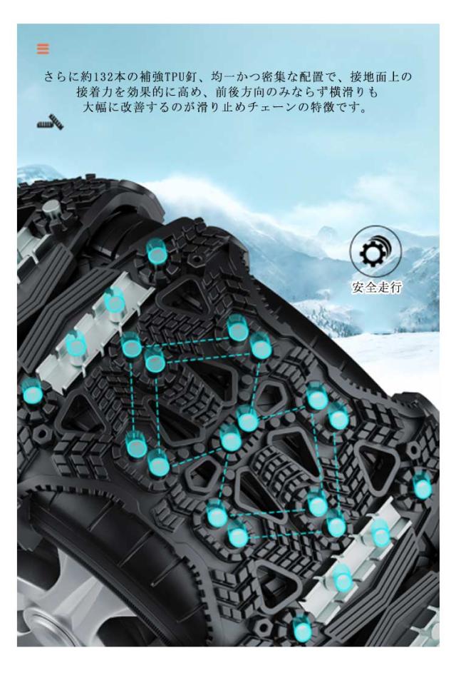 | 4本入 全新改良版のパターン 【超強力な滑り止め・砕氷能力】全新改良版のパターン構造を設計しました。車用タイヤチェーンは強力な超硬化砕氷鋼板を2本・鋼鉄釘を21個に増やし、凍結路面をしつかり砕き、路面に力強く干渉し抜群のグリップカを生み出します。さらに約132本の補強TPU釘、均一かつ密集な配置で、接地面上の接着力を効果的に高め、前後方向のみならず横滑りも大幅に改善するのが滑り止めチェーンの特徴です。 【耐久性に優れたTPU&低騒音・低振動】本非金属タイヤチェーンは耐摩耗性・耐低温・抗張力(伸ばしたり引っ張ったりするカ)なTPU(熱可塑性ポリウレタン)材質を採用されます。 【取付簡単&女性でもOK!】取付に簡単なタイヤチェーン 非金属はジャッキアップなど複雑な道具・車両移動不要で、チェーンをタイヤに簡単かつ迅速に取り付けることができます。 【サイズ調整可能&165-285mm対応】バンドと機械式バックル式のタイヤチェーン、ロックでサイズを自由に調整可能なので、偏平率アル構造・リム径などの面倒な考えが要らず、タイヤ幅のみ考える必要あります。幅165mm-285mmまでのタイヤに対応スノーチェーンなので、ユニバーサル車、SUV、軽トラックなど幅広い車種に適応します。 | |