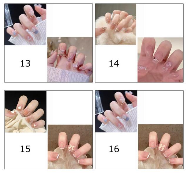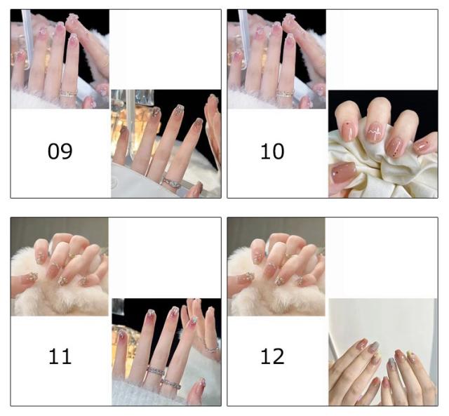 | サイズについての説明 | 付け方:1、爪の表面をキレイにする。2、適切なサイズのを選ぶ。3、爪の表面にを貼る(※汚れ注意)。4、粘着力を高めるため、数秒間押す。5、保護フィルムをはがす。6、好きなネイルを付けて、完成! |