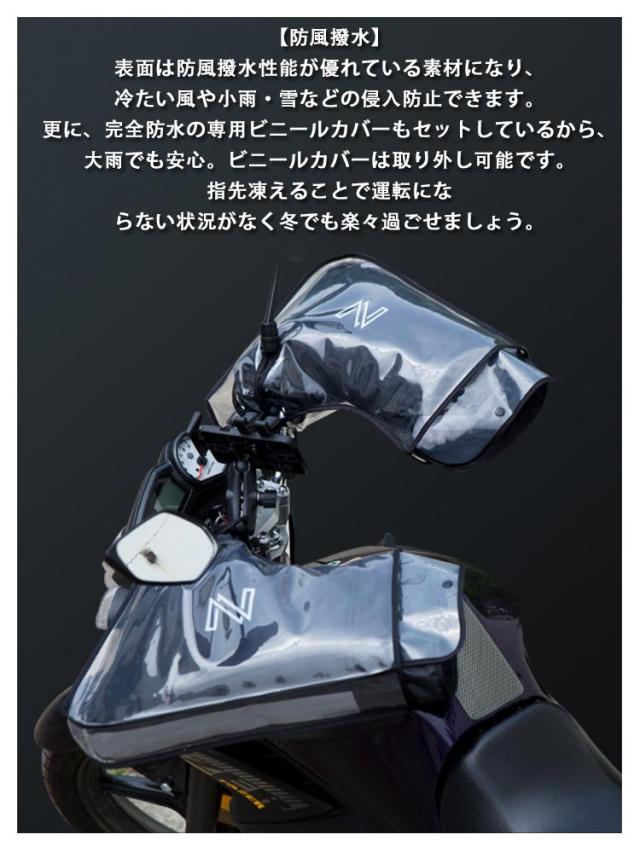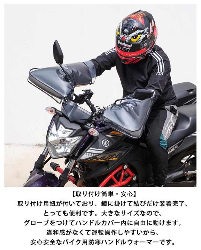 | 【防寒保温】 裏側はもこもこ保温性が良いフリース素材を使用して、中には中綿で充填された仕様になり、グリップから手首までしっかりカバーすることができます。厚手で防寒性が抜群です。 【防風撥水】 表面は防風撥水性能が優れている素材になり、冷たい風や小雨・雪などの侵入防止できます。更に、完全防水の専用ビニールカバーもセットしているから、大雨でも安心。ビニールカバーは取り外し可能です。指先凍えることで運転にならない状況がなく冬でも楽々過ごせましょう。 【取り付け簡単・安心】 取り付け用紐が付いており、鏡に掛けて結びだけ装着完了、とっても便利です。大きなサイズなので、グローブをつけてハンドルカバー内に自由に動けます。違和感がなくて運転操作しやすいから、安心安全なバイク用防寒ハンドルウォーマーです。 【汎用タイプ】 取り付け口が小口と大口の2タイプ展開、市場大部分な車種に対応できる汎用ハンドルカバーです。 【反射テープ付き】側面と正面はリフレクターが施され、視認性アップされ、夜の走行の安全もしっかり守る。 | |