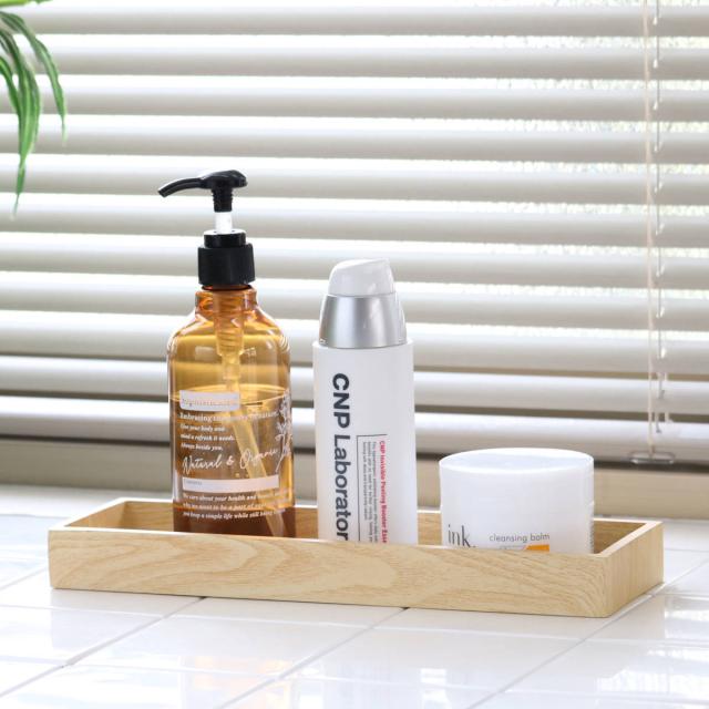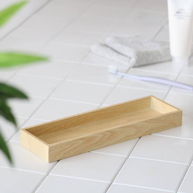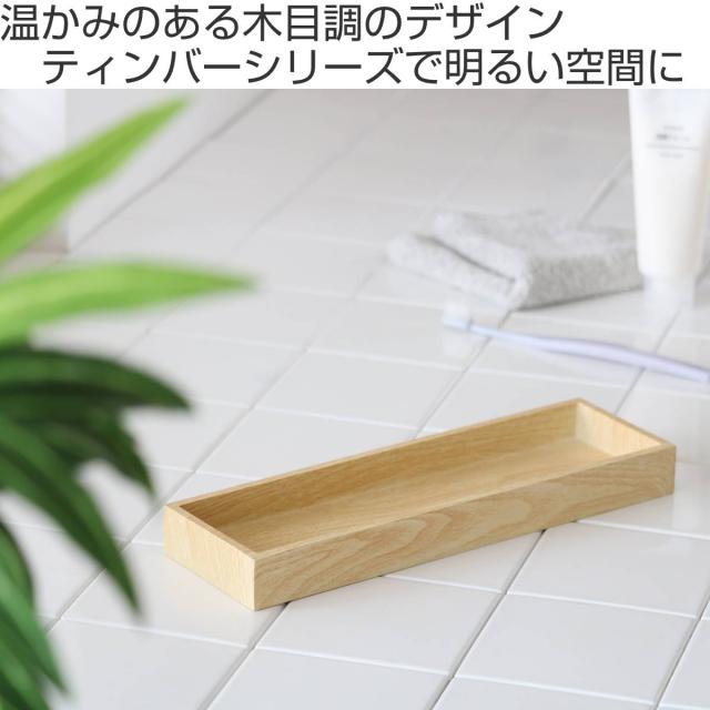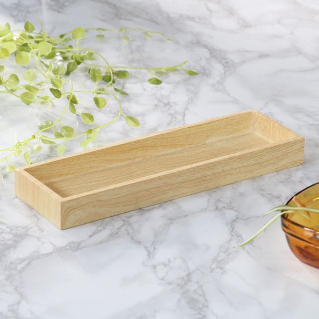 木目調のシンプルなデザインでどんな空間にも合うティンバーシリーズのトレーです。よく使う洗面小物などを置いて、キッチンや洗面所などお好みの場所でお使いいただけます。