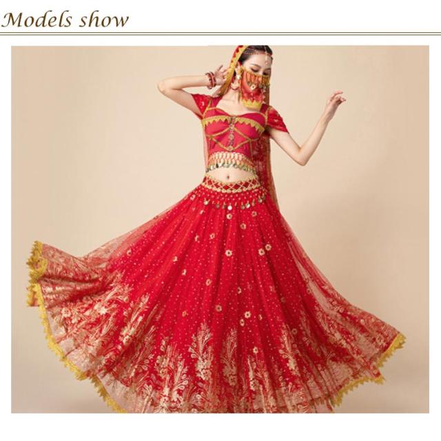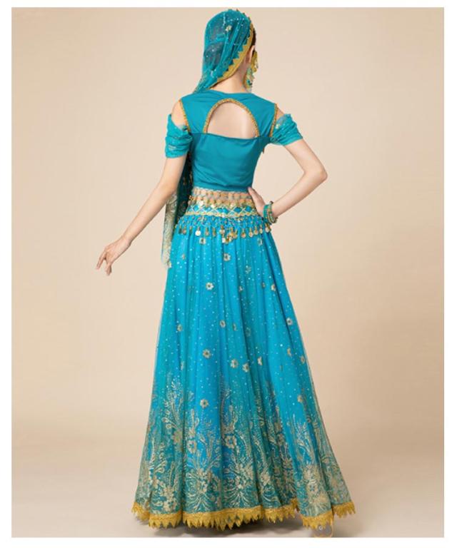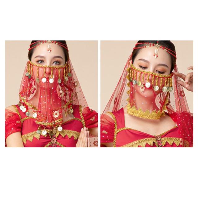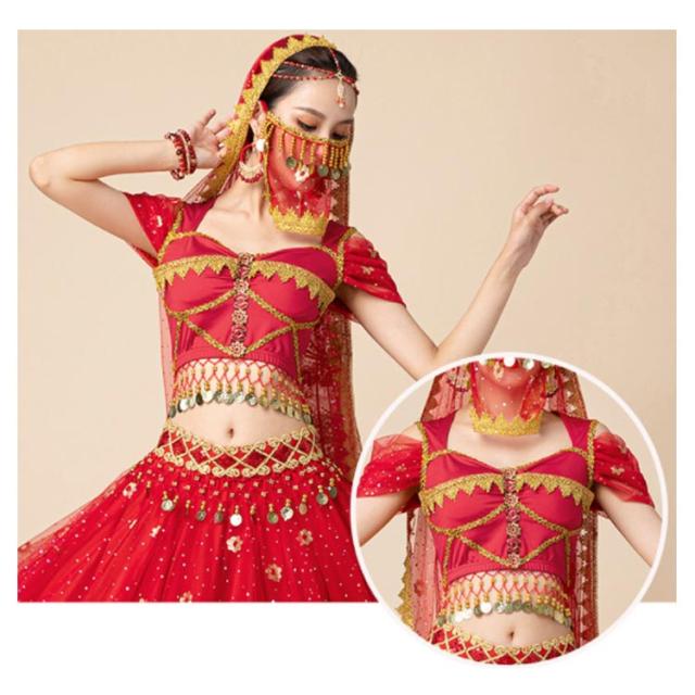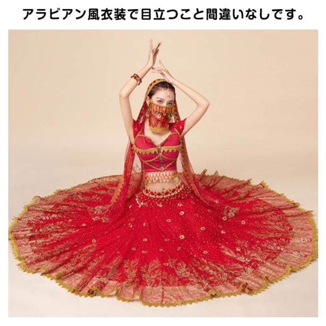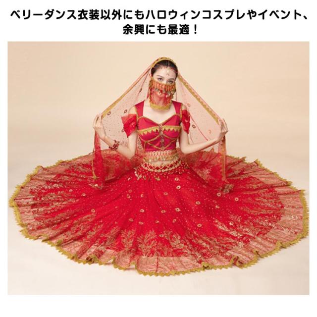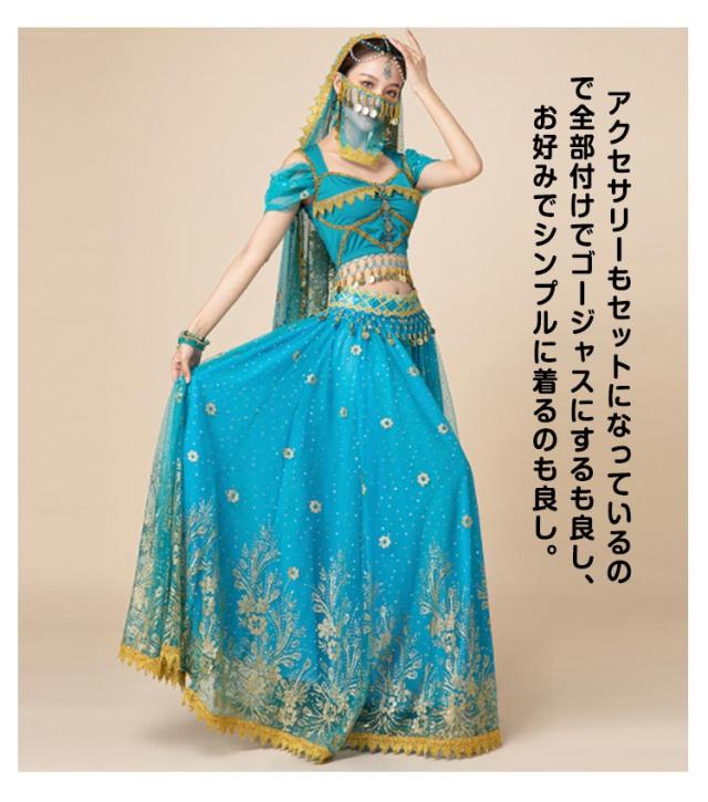 ベリーダンス衣装 上下セット 7点セット 半袖 アラビアン 衣装 ダンス衣装 トップス スカート ウエストアクセサリー ベール ヘッドアクセサリー イヤリング マスク ブレスレット ハロウィン コスチューム コスプレ衣装 ステージ衣装 イベント 余興 仮装 送料無料