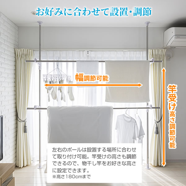 お部屋に合わせて取り付け可能部屋のスペースに合わせて自由に設置できます。 突っ張りポールの間隔が長いほど、たくさんの洗濯物を干す事が出来ます。