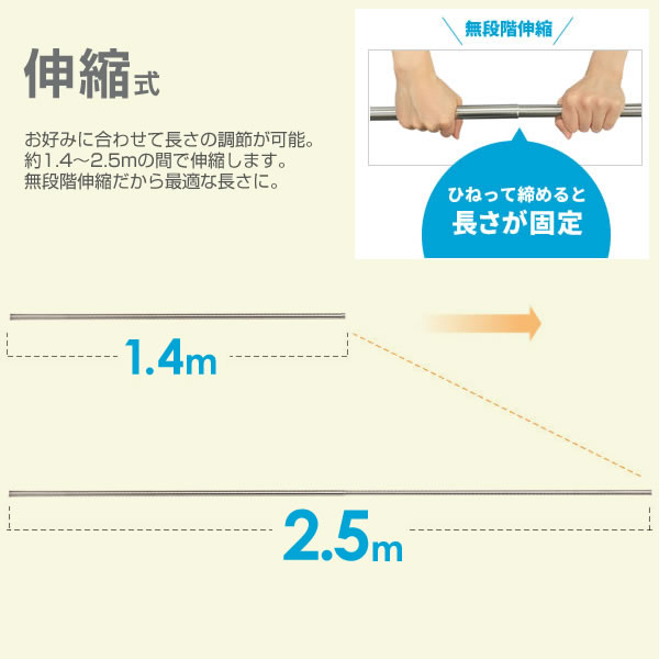 長さ調節可能な伸縮式。1.4〜2.5mの範囲で、必要な長さにしてお使いいただけます。