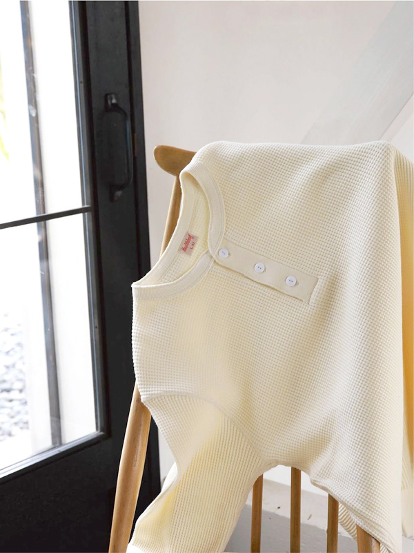Healthknit Superschweres Langarm-T-Shirt mit Henley-Ausschnitt und Waffelmuster ヘルスニット スーパーヘビーワッフル ヘンリーネック長袖Tシャツ 【Healthknit(ヘルスニット)】 1900年にテネシー州ノックスヴィルで高品質なアンダニットウエアメーカーとして誕生した「ヘルスニット」。 代表作であるヘンリーネックTをはじめ、今もなおアメリカ南部の上質な原料から 紡績、ソーイングまでの一貫した生産管理でデザインされています。 Healthknit秋冬の定番素材、編み機の限界まで度詰めにした『スーパーヘビーワッフル』と呼ばれる素材を使用しています。 肉厚かつ伸縮性に優れた素材は保温性に富み、極上の着心地と暖かさを提供します。 ヘルスニット定番モデルである、ベーシックな3つボタンヘンリー。 余分なゆとりを排除した肌に沿うようなシルエットで、インナーとして最適なフィット感の1枚です。 袖口は横編み機で編み立てられた、ヴィンテージライクなタック入りリブで仕上げています。 | ||||||||||||||||||||