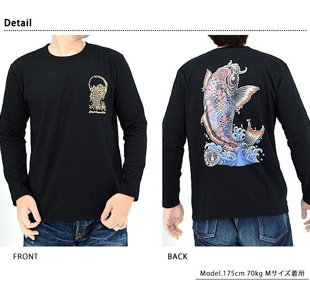 CHIGIRIさんから「手描き風大鯉インクジェットロングTシャツ(CHL57-652)」のご紹介です。 CHIGIRI人気の手描き風プリントTシャツから最新作が登場しました! 今回は、背中にダイナミックに彫り込まれた刺青がインパクト抜群の大鯉柄です。 波間から跳ね上がる躍動感溢れる姿を切り取りました。 バックにしっかり柄を入れている分、フロントはシンプルに仕上げ、メリハリを付けました。 フロント左胸には、大鯉をワンカラーでプリントしています。 ボディーには、薄手で柔らかいTシャツ生地を採用しました。 | |||||||||||||||||||||||||