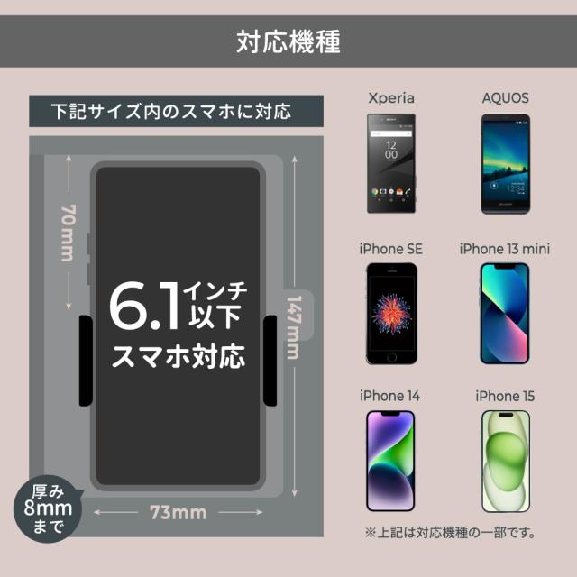 ■対応最大サイズ:約 73(W) × 8(D) × 147(H) mm までのスマートフォン