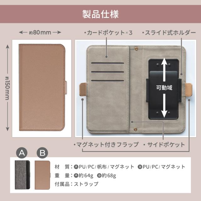 手帳型 マルチケース 最大6.1インチ対応 スマートフォン用 スライド式ホルダー付き PUレザー