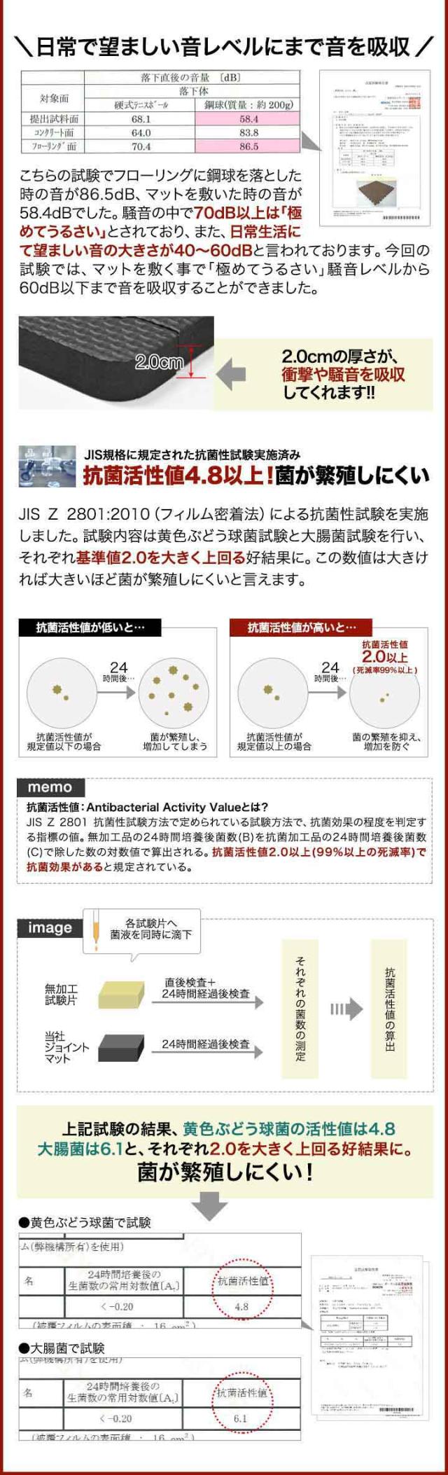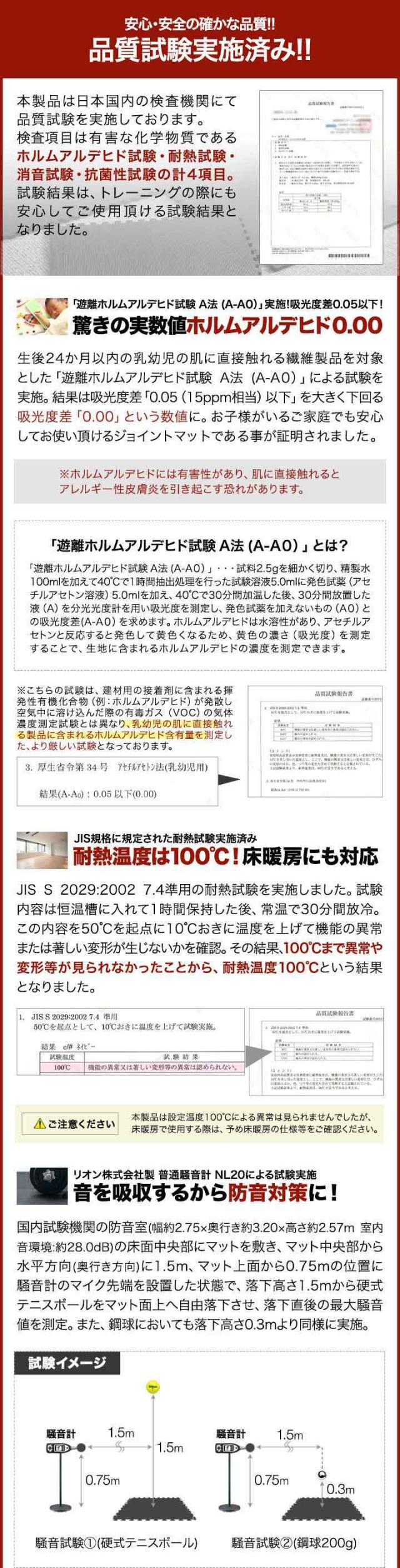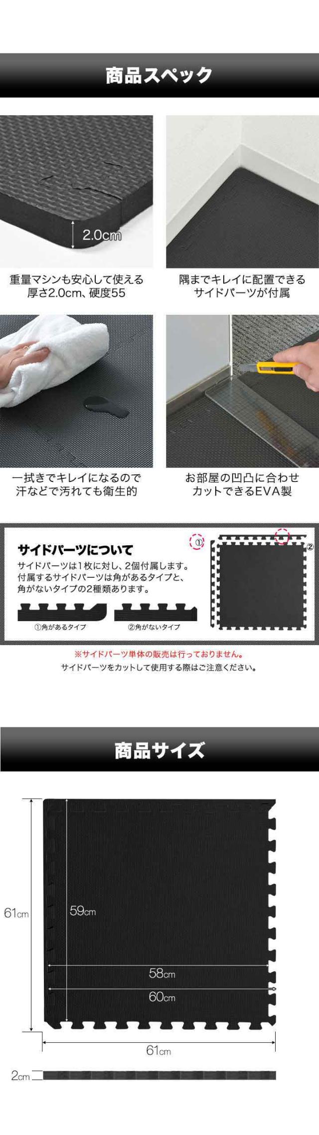 | 特記事項: ※サイドパーツ単体の販売は行っておりません。サイドパーツをカットして使用する際はご注意ください。 ※長期間の使用など、ご使用の環境によって商品の色が床材の表面に色移りする場合がありますのでご注意ください。 ※EVA樹脂の臭いが最初はある程度しますが、人体には影響ありません。臭いによる返品はお受けできませんので、臭いの気になる方はその旨をご了承の上ご購入をお願いします。 |