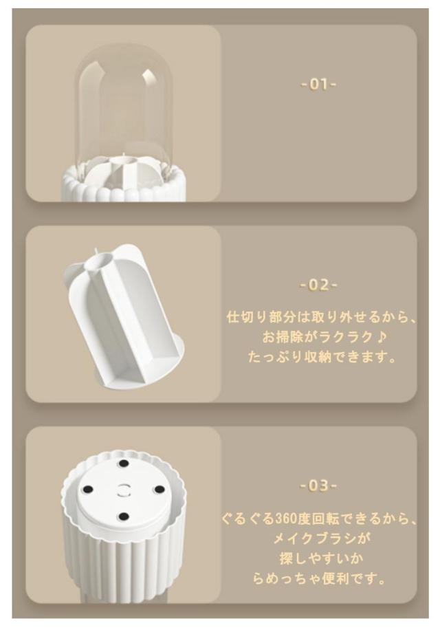 | 360度回転のメイクブラシ収納ボックス ふた付きだから、ほこりがつきません。おしゃれなドーム型蓋なので、様々な長さのブラシを綺麗に収納できます。 ボリュームのある波模様が可愛く、インテリアにもなるおしゃれなデザイン、母や彼女など女性へのプレゼントとしてオススメです。 仕切り付きで種類を分けて賢く収納できるから収納が苦手な方も収納上手になる化粧ブラシ収納ボックス。 仕切り部分は取り外せるから、お掃除がラクラク♪たっぷり収納できます。 ぐるぐる360度回転できるから、メイクブラシが探しやすいからめっちゃ便利です。 ゴムパッド付きだからドレッサーや机を傷つけません。 | |