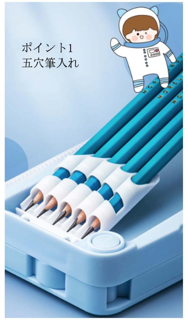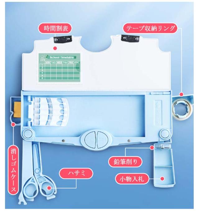 | 多機能一体式 9TYPE ポイント1 五穴筆入れ ポイント2 消しゴムケース ポイント3 ハサミ専用ケース(ハサミ付き) ポイント4 鉛筆削り+小物入れ ポイント5 テープ収納リング(テープ付き) | |
