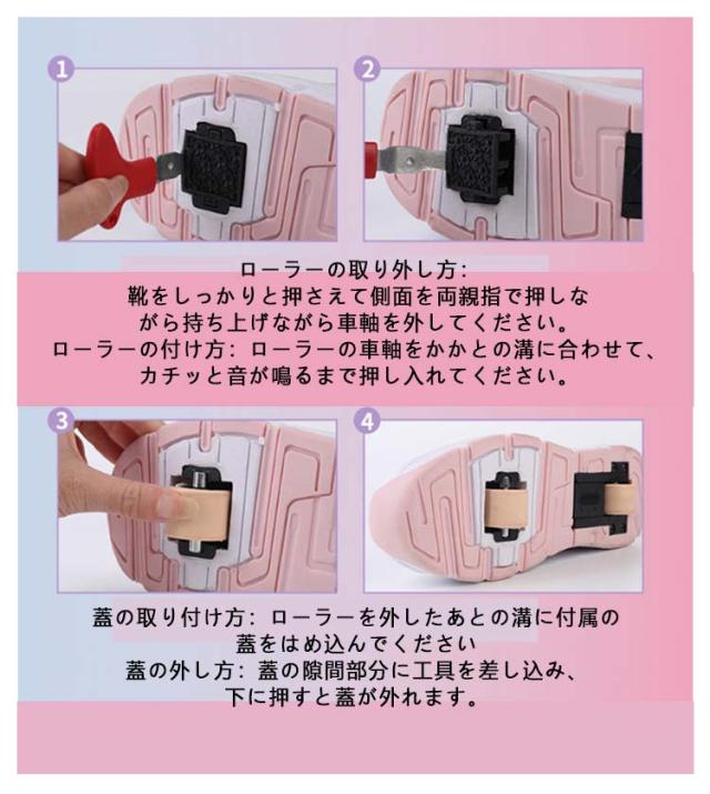 | 夏のお出かけや旅行などにピッタリな大人気ののローラーシューズです ローラーは取り外しができるタイプで、付属の蓋をハメればスニーカーとしても使えます! ローラーの取り外し方:靴をしっかりと押さえて側面を両親指で押しながら持ち上げながら車軸を外してください。 ローラーの付け方:ローラーの車軸をかかとの溝に合わせて、カチッと音が鳴るまで押し入れてください。 蓋の取り付け方:ローラーを外したあとの溝に付属の蓋をはめ込んでください 蓋の外し方:蓋の隙間部分に工具を差し込み、下に押すと蓋が外れます。 | |