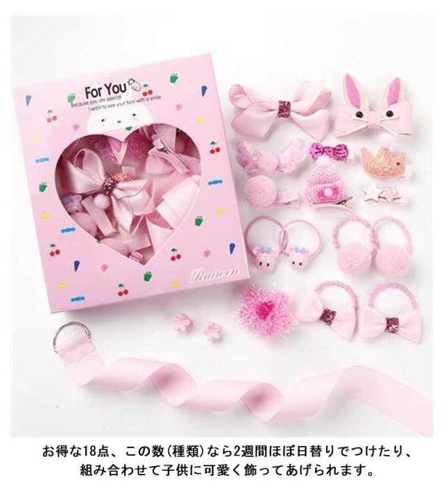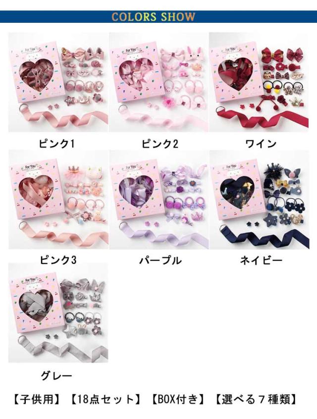 | 【子供用】【18点セット】【BOX付き】【選べる7種類】 お得な18点、この数(種類)なら2週間ほぼ日替りでつけたり、組み合わせて子供に可愛く飾ってあげられます。 付けるだけで可愛くおしゃれに!豊かなデザインや色で気分やお洋服に合わせて選ぶのも楽しいです。 ギフトボックス付き、孫娘、娘や妹などへのちょっとした贈り物にもおすすめです。 普段使いにはもちろん、入園式、卒園式、七五三、子供の日、発表会、結婚式、パーティーなどに。 | |