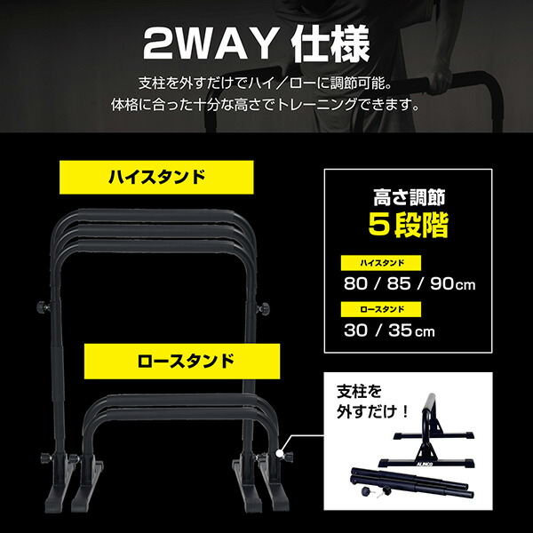 ディップススタンド 2個セット ハイスタンド ロースタンド 2WAY FA53 ブラック ディップス運動 筋トレ 高さ調節5段階 腕立て 鉄棒 トレーニング器具 プッシュアップ 上半身 下半身 フィットネス エクササイズ アルインコ ALINCO 【送料無料】