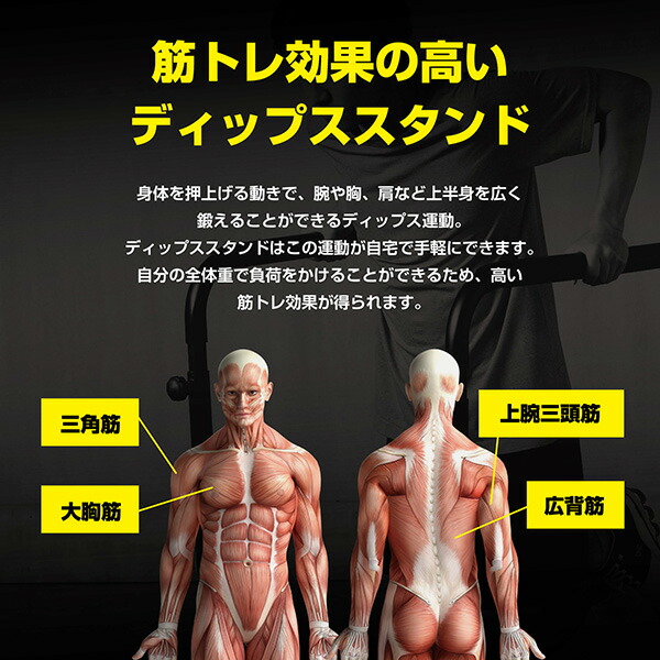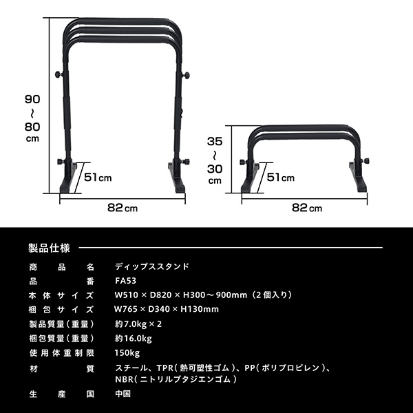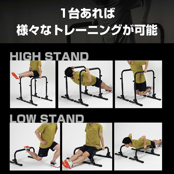 | 商品説明 | ●2個セット ●手軽にディップス運動 ●自宅でのトレーニング効果を高め、運動の幅を広げます ●高さ調節5段階 ●ハイスタンド/ロースタンドの2WAY仕様 ●滑り止めゴム付き ●握りやすいクッショングリップ ●1台あれば様々なトレーニングが可能 ●身体を押し上げる動きで腕や胸、肩など上半身を広く鍛える< ●使用体重制限:150kg ●メーカー1年保証 |