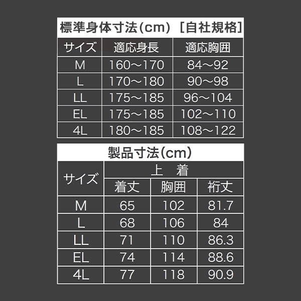| 本体サイズ | M:着丈65 胸囲102 裄丈81.7cm L:着丈68 胸囲106 裄丈84cm LL:着丈71 胸囲110 裄丈86.3cm EL:着丈74 胸囲114 裄丈88.6cm 4L:着丈77 胸囲118 裄丈90.9cm |
