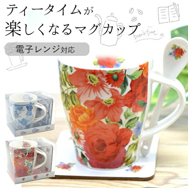 【おうちカフェをもっと楽しく】マグカップ 大人可愛い おしゃれ 大きい コースター スプーン付き 電子レンジ対応 花柄/食器柄 ギフト プレゼント 贈り物 誕生日 母の日 敬老の日 還暦祝い 新生活
