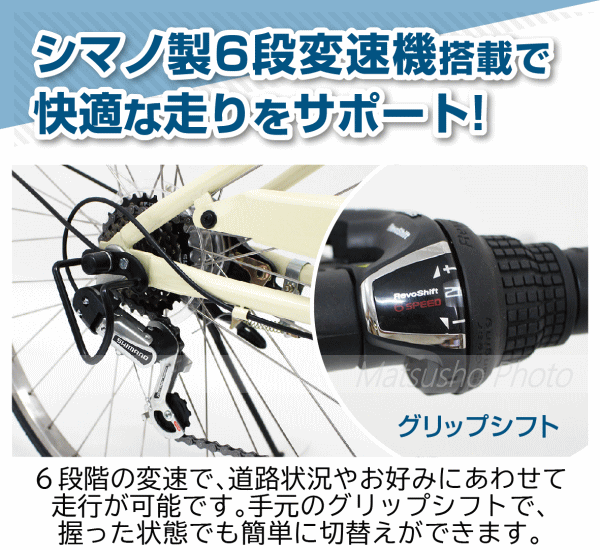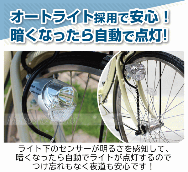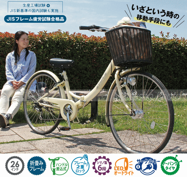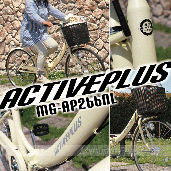 ノーパンク折りたたみ仕様の軽快車。パンクの心配もなく空気入れの手間も省けて嬉しい1台!■メーカー:ミムゴ■商品名:ACTIVE PLUS ノーパンクFDB266SL■型番MG-AP266NL■商品サイズ:26インチタイヤ[組立時]約W181×D58×H105cm[折畳時]約W98×D60×H93cm[カゴ]約W37×D24×H26cm■サドル地上高さ約77〜89cm■適応身長目安約149cm■商品重量約19.7kg■材質:スチールフレーム■カラー:オフホワイト■仕様:ノーパンクタイヤ・折畳みフレーム・6段変速・カゴ・LEDオートライト・サークルキー■生産国:中国■組立・調整箇所:簡単な組立が一部必要です。(ハンドル取付、ペダル取付、サドル取付、カゴ取付)【代引&同梱&配達時間指定不可・北海道&沖縄&離島への発送不可】※到着は地域によって異なり大型商品の為、3〜6営業日程掛かります。予めご了承頂きます様お願い致します。本商品は一般家庭用に開発された商品です。業務用ではありません。激しい乗り方をされますと故障の原因になります。
