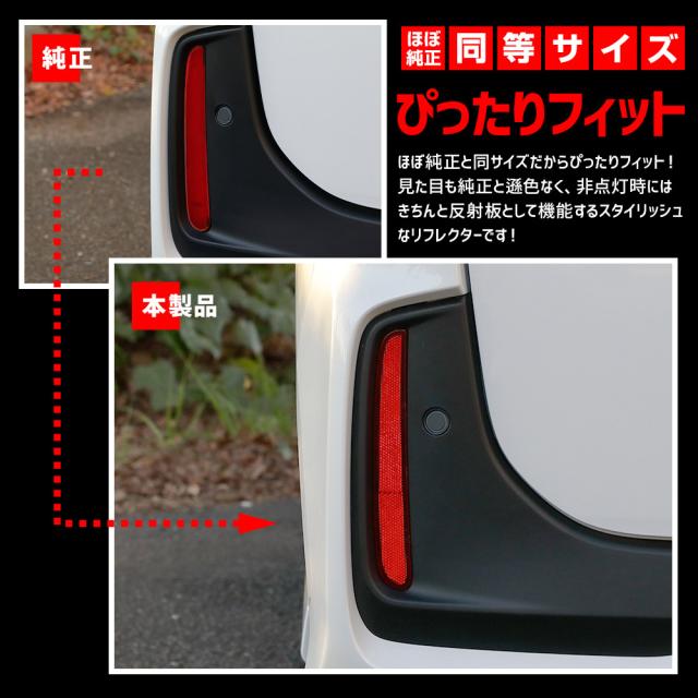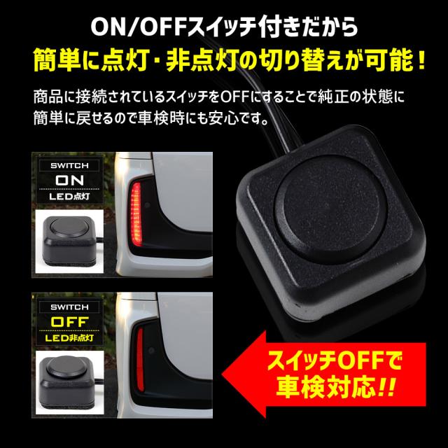 リフレクターを光らせることで後続車からの認識性UP! ポジション点灯・ブレーキでより強く点灯する2段階点灯。 高輝度LEDを使用しているので日中でもしっかり後続車にアピールできます! LEDで光らせることで他車からの認識性が高まり、安全性の向上も期待出来ます。 普段は光らないところが光るため、個性的かつスタイリッシュなリアビューを演出します。 専用設計のため、純正と同じサイズでぴったり違和感なく装着可能。まるで純正のような一体感! 専用カプラー付きだから純正の配線を傷つけることなく取り付け可能なのもおすすめポイントです。 ※取り付けの際にバンパーのリフレクター部分の裏面から配線を通すための穴を開ける作業がございますので、電動ドリルなどの工具が別途必要です。 純正同等の反射板レンズを採用しているので、車検にも対応しています。※非点灯時のみ |