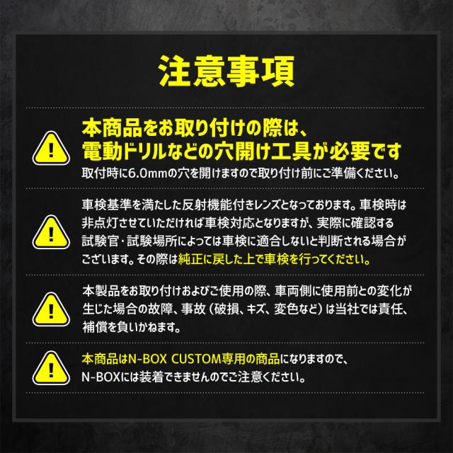| ■本商品をお取り付けの際は、電動ドリルなどの穴開け工具が必要になります。 ■車検基準を満たした反射機能付きレンズとなっております。車検時は非点灯させていただければ車検対応となりますが、実際に確認する試験官・試験場所によっては車検に適合しないと判断される場合がございます。その際は純正に戻した上で車検を行ってください。 ■本製品をお取り付けおよびご使用の際、車両側に使用前との変化が生じた場合の故障、事故(破損、キズ、変色など)は当社では責任、補償を負いかねます。 ■本商品はN-BOX CUSTOM専用の商品になりますので、N-BOXには装着できませんのでご注意ください。 |