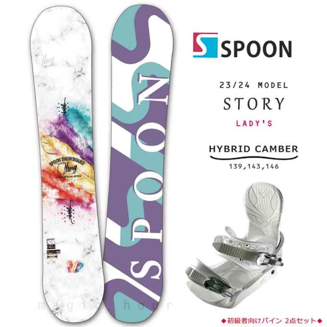 スノーボード 板 セット レディース 2点 スノボー ビンディング SPOON スプーン STORY 23-24 初心者 ハイブリッド キャンバー ボード 白 ホワイト 青 柔らかい