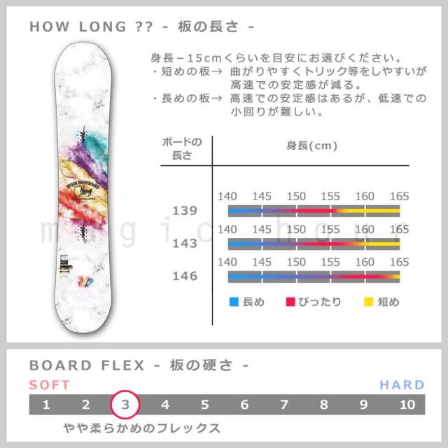 サイズ選びのポイント ボードサイズ…女性 身長マイナス15cm前後がおすすめ! 153cmの方→138くらいの板 157cm方→142くらいの板 顎から鼻辺りまでの長さが一般的に乗りやすい長さになっています。 |