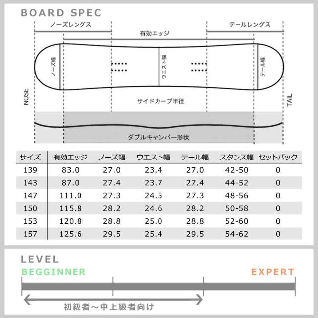 脚力に自身のない女の子でも乗りやすい!軽量&ソフトフレックスでかんたん楽々ターン♪ 足下付近がキャンバー、センターはロッカーになった2つの乗り味を楽しめるWキャンバー形状。 ロッカーの楽しさと、しっかり踏みこむことでキレのあるカービングもできるのでオールラウンドで楽しめる♪FUNな乗り心地でグラトリにもおすすめ! 形状:ダブルキャンバー(ガルウィング), ツインチップ, SW構造 / バイン:操作性の良いアシメントリー形状のハイバック, ミドルフレックス |