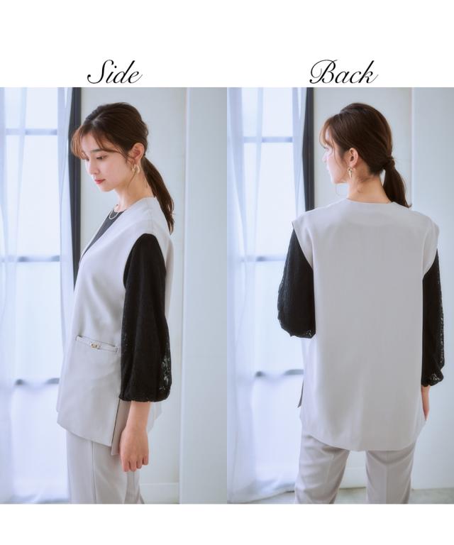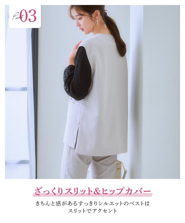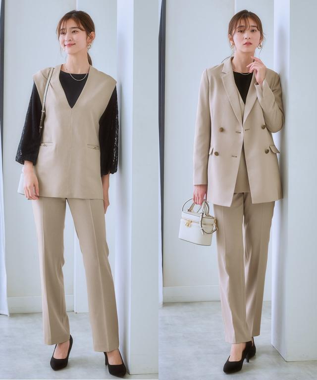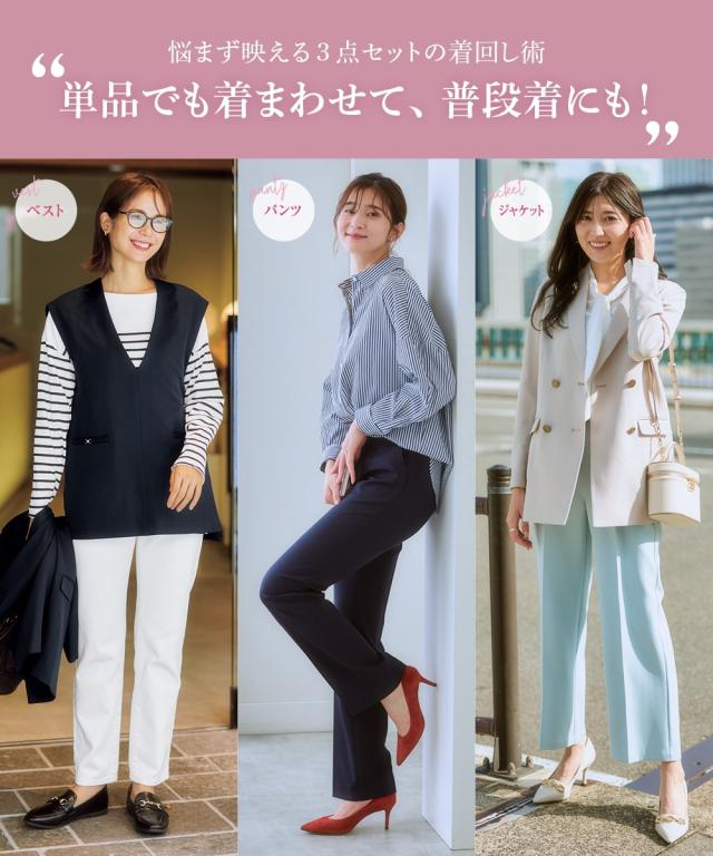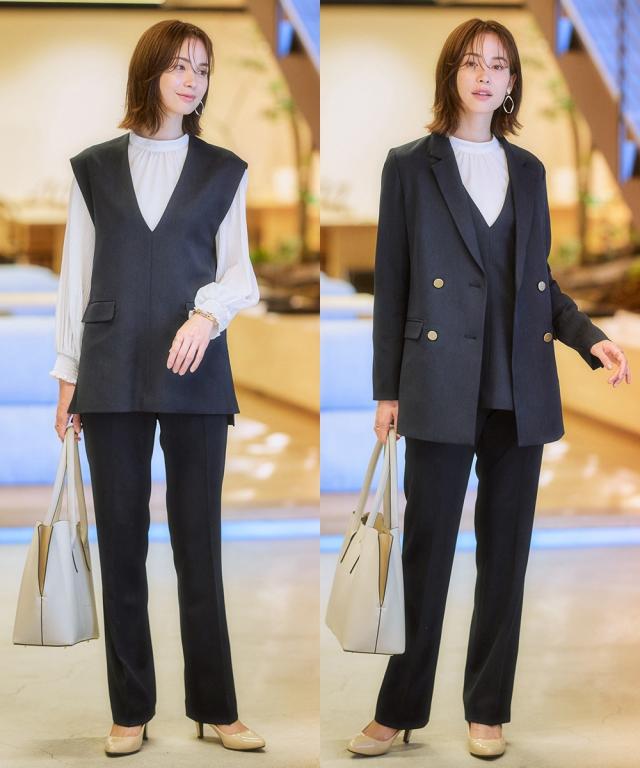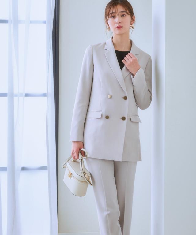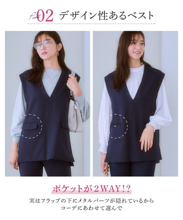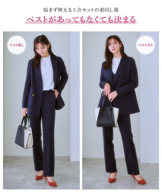 「選ばれ続けるドビー素材シリーズ」から新型が登場!表情のある表面感が魅力のドビー素材を使った、イマドキシルエットのセットアップスーツ。お仕事シーンをサポートする機能性やきれい見えデザインはもちろん、単品使いやオフに使える着回し力も◎・ジャケット:ゆるっとしたダブルブレストテーラードジャケットはきちんと感があり、少し長め丈なので体型カバーもかなうのが嬉しい♪・ベスト:トレンド感もあるVネックのベストは単品でも着回し力抜群!ポケット部分の金具はフラップ部分で隠すこともできるので、シンプルなベストとしてもご着用