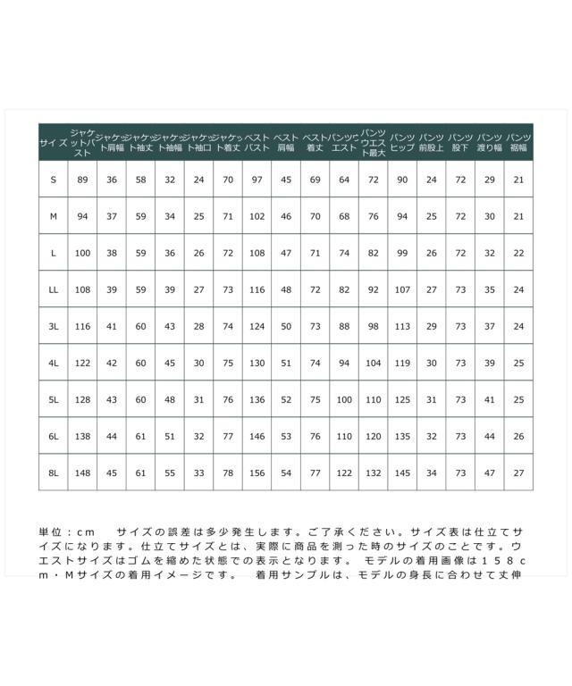 品質=[表地]ポリエステル100%(織物ドビー) [裏地]有(ジャケット:背抜き ベスト:総裏) パンツ無 ジャケット:肩パッド無 前ボタン開 ポケット前2・左内 袖口ベンツ 後ベンツ パンツ:前ファスナー内ボタン付ホック開 ウエスト後ゴム入 ポケット両脇・後飾り ベスト:ポケット前2 両脇スリット ※この商品は3点同サイズのみで販売します。 ※LLサイズから四面体仕様です。 原産国:中国製(企画デザインは日本) 洗濯表示:洗濯機OK ネット使用