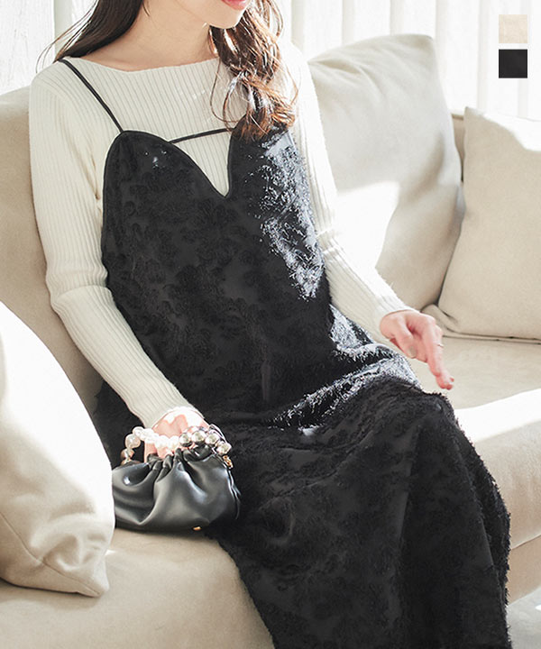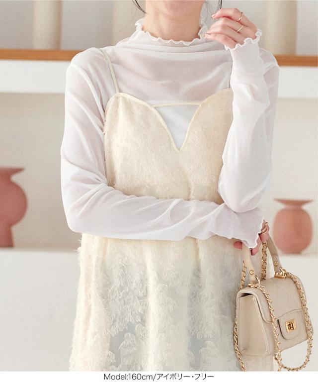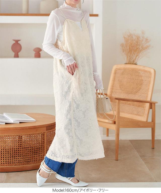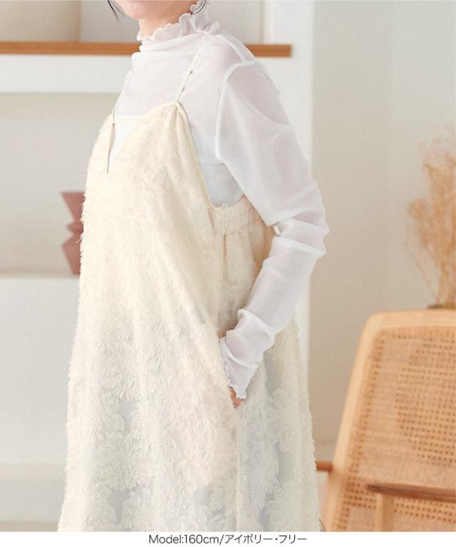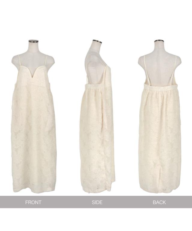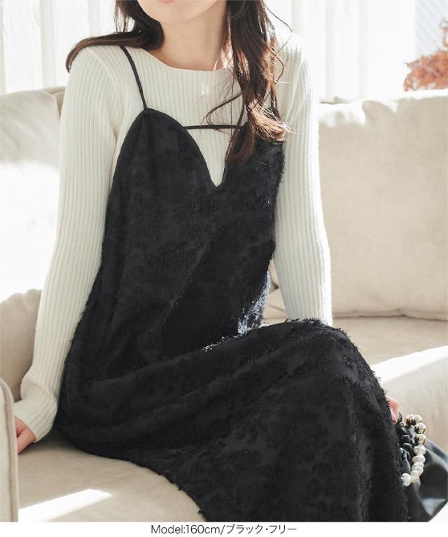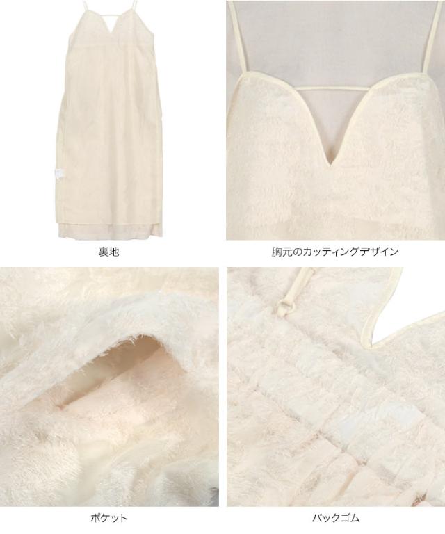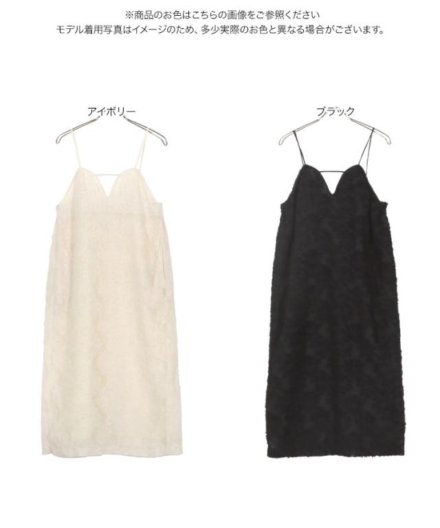 春新作 胸元カッティングフェザーキャミワンピース E3364 入荷済 レディース ワンピース ロング丈 フェザー シャギー マキシワンピース キャミソール ストラップ Vネック 白 アイボリー 黒 ブラック 30代 40代
