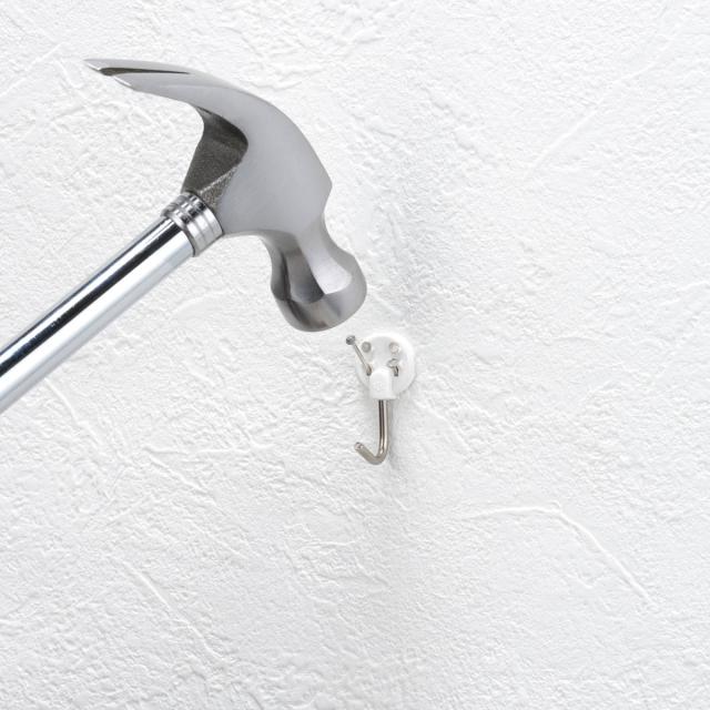 2.本体を壁に押しあて、ハンマーでピンを1本ずつゆっくりと打ちこみます。下側のピン2本は斜め下へ打ち込んでください。(最後まで打ち込んでから次のピンを打ってください)