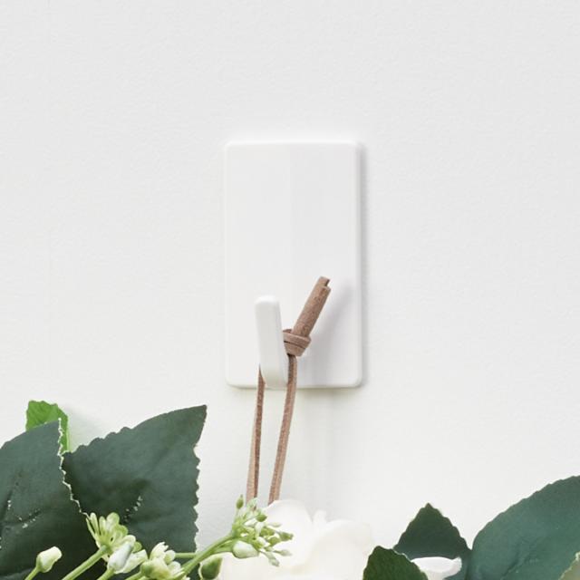 プリント合板・タイル・金属塗装面などに粘着テープで取り付けるフック2個入りです。薄くても丈夫なポリカ—ボネート製で、耐荷重2.5kgです。キッチンでは調理用品やキッチン小物の収納に、洗面所では洗濯用品や掃除グッズを、玄関先では折り畳み傘やミニバッグなどの小物掛けに最適です。