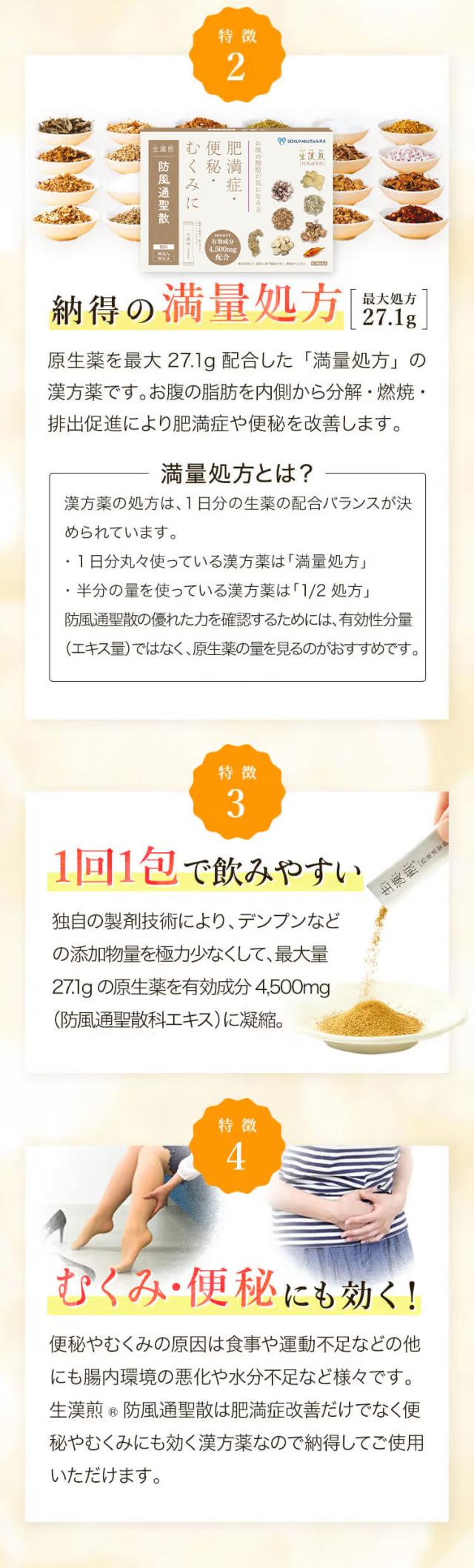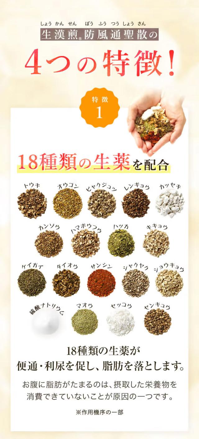 「生漢煎 防風通聖散」は有効成分を引き出す時に使用される原料の量である「原生薬」が1日の制限できる最大量である27.1g配合されていて、個包装してあるので、持ち運びに便利です。