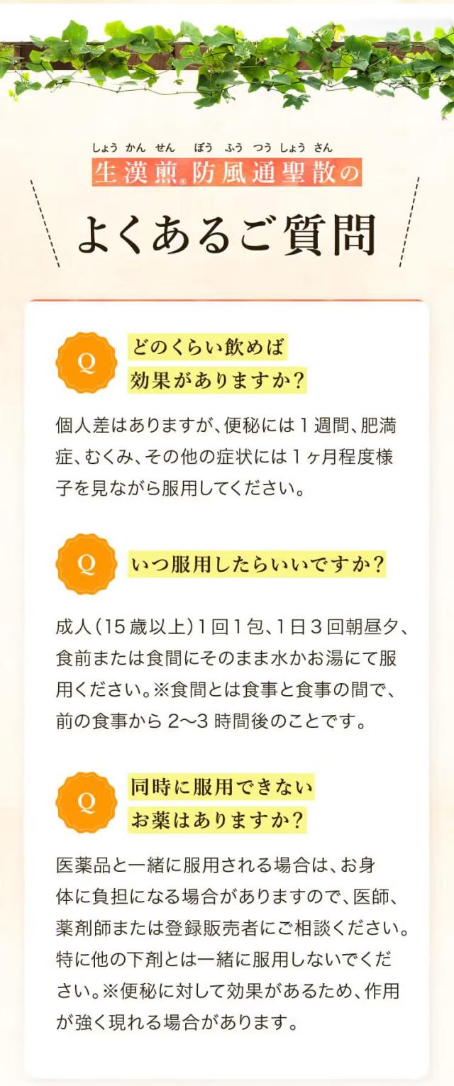 | 用法・用量 | 次の量を1日3回朝昼夕、食前又は食間にそのまま水かお湯にて服用する 成人(15歳以上)……1回1包 15歳未満……服用しないこと [用法・用量に関する注意] 用法・用量を厳守すること ※食間とは食事と食事の間を意味し、食後約2〜3時間のことをいいます。 |