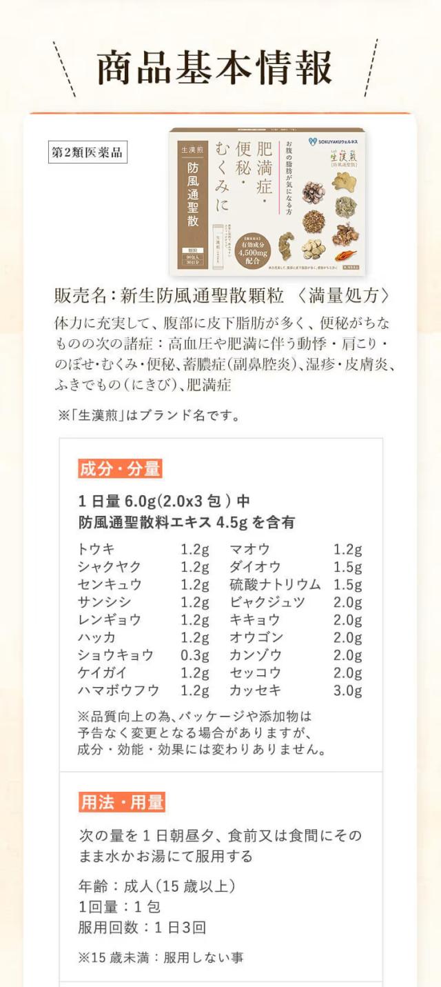 | 成分・分量 | 1日量6.0g(2.0g×3包)中 防風通聖散料エキス4.5gを含有 トウキ……1.2g ショウキョウ……0.3g ビャクジュツ……2.0g シャクヤク……1.2g ケイガイ……1.2g キキョウ……2.0g センキョウ……1.2g ハマボウフウ……1.2g オウゴン……2.0g サンシン……1.2g マオウ……1.2g カンゾウ……2.0g レンギョウ……1.2g ダイオウ……1.5g セッコウ……2.0g ハッカ……1.2g 硫酸ナトリウム……1.5g カッセキ……3.0g [添加物] 添加物として、ヒブロメロース、ステアリン酸マグネシウム、D-マンニトールを含有する。 本剤は天然物(生薬)のエキスを用いた製品ですので、顆粒の色や味が多少異なることがありますが効能又は効果にかわりありません。 |